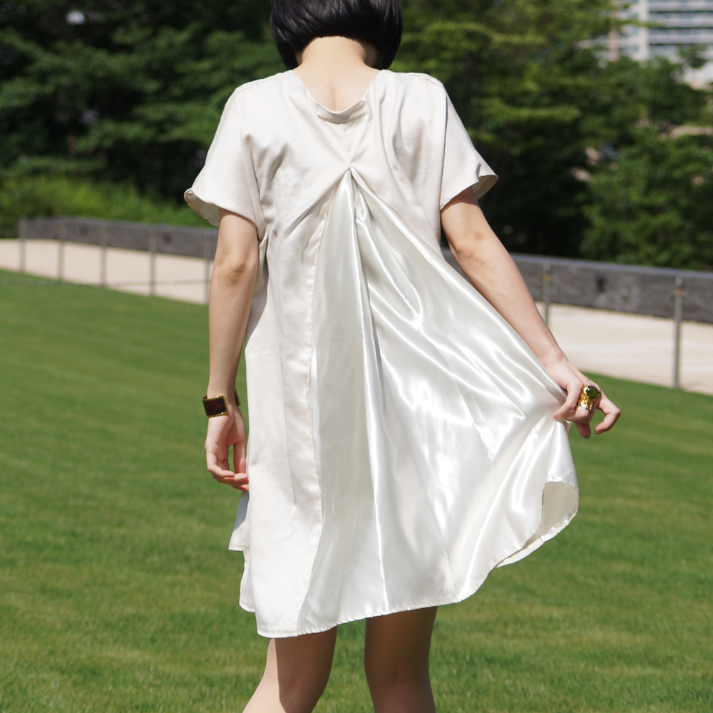 チューブトップ(ワンピースに見えますが)にサテンリボンを肩に通して、結び目で留めてるだけのシンプル構造。